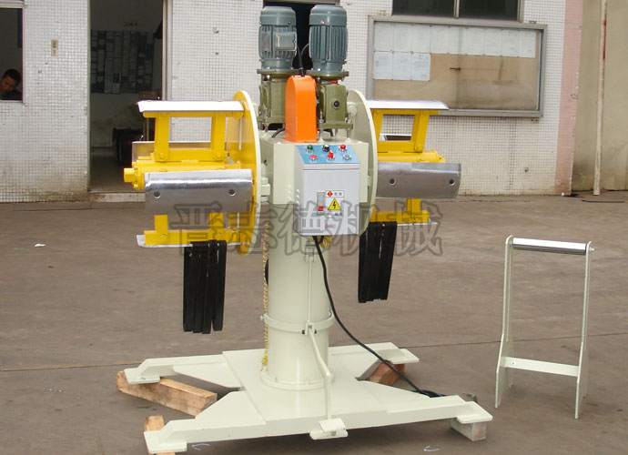 若使用雙頭材料架作為收料設備使用則能從根本上提升生產效率,晉志德雙頭材料架有兩個漲縮筒,可以兩個漲縮筒交替進行收料工作,其通過設置的具有頂部呈弧形支撐塊的旋臂,可以方便的通過材料架上設置的推卸機構將料卷推送至對應的旋臂上,然后將該旋臂旋轉至卸料區后,即可通過吊鉤卡進設置的卡槽內將料卷方便的吊運至卸料區的指定位置,中間只需人工轉動旋臂至指定位置,無需耗費大量人力,且有效提升了料卷轉運效率。