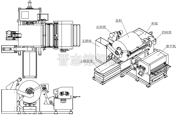 由中板三合一送料機(jī)搭配沖床組成的沖壓生產(chǎn)線實(shí)現(xiàn)全自動(dòng)化的作業(yè)流程,從原材料入料裝料、整平、送料,至自動(dòng)出料完全高速作業(yè),出料速度達(dá)到每分鐘18米,降低成本,提高生產(chǎn)效率。中板三合一送料機(jī)NCSF6-900適用于材料厚度0.5-4.5mm中板卷材,下圖為其總裝配圖: