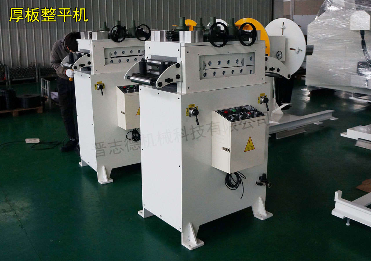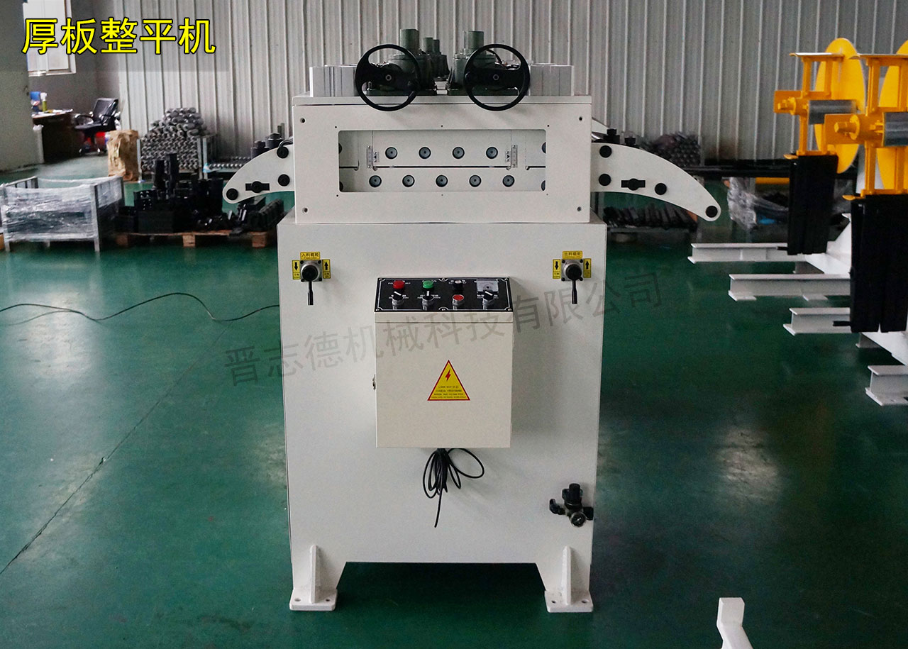 沖壓制造行業除需使用到0-3.0mm的薄板、中板材料外,同樣也會用到3.0mm以上的厚板材料,用于此類厚板材料整平的設備則稱為厚板整平機,厚板整平機又分為適用料厚0.5-4.5mm與適用料厚1.0-6.0mm的這兩種款式,它們的外觀為相似,但其使用的滾筒直徑、馬達的大小及齒輪齒合的角度是不同的。